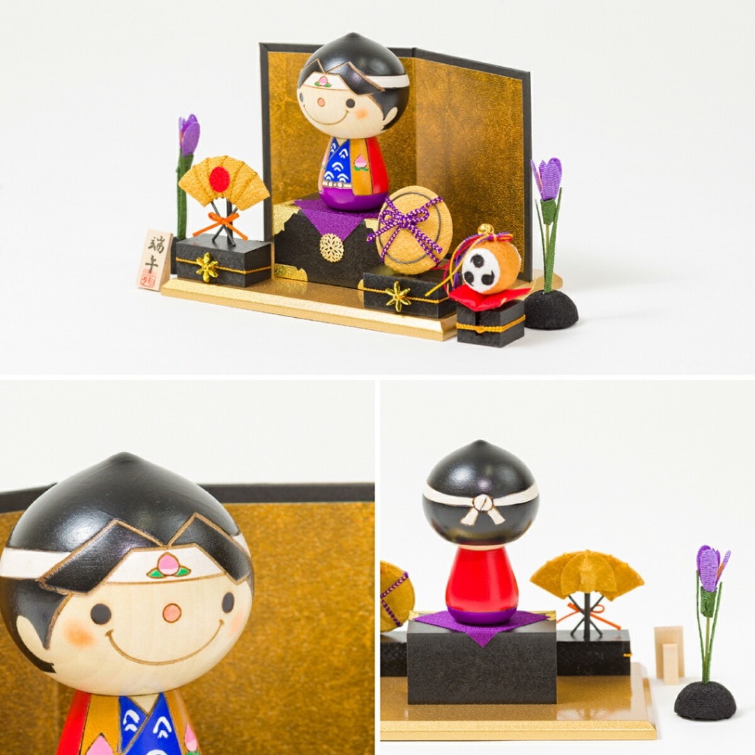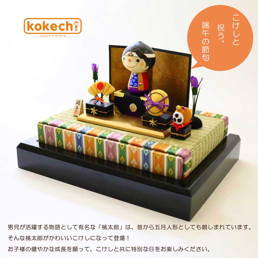 | 男児が活躍する物語として有名な「桃太郎」は、昔から五月人形としても親しまれています。そんな桃太郎がかわいいこけしになって登場! 端午の節句で定番の菖蒲や三品、金屏風などが付属した豪華なフルセットです。 こちらのセットには桃太郎の家来のイヌ・猿・キジが付いて来ます! 端午の節句に欠かせないちまきと柏餅のお飾り付き。初節句やこどもの日にぴったりなこけしセットです。 こども目線を重視して、小さなお子さまから大人まで楽しめるこけしを。卯三郎の孫が作るこけしはどれも手のひらに収まるほどコンパクトでかわいいサイズです。小さい子供でも手に取れて木の温もりを感じる、日本の伝統に触れる。そんな光景を想像しながら一つひとつ丁寧に手作りしています。お部屋のインテリアに自然ととけこむkokechi。大切な方への贈り物・ギフトにもご利用いただいています。 |