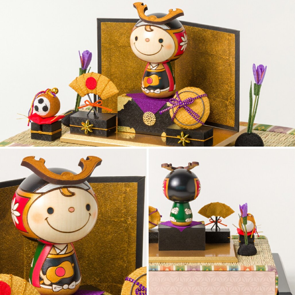 勇ましい五月人形をデフォルメして可愛い若武者こけしが誕生しました。端午の節句で定番の菖蒲や三品、金屏風などが付いた豪華なセット。専用飾り台と合わせておめでたい雰囲気です。初節句のお祝いにぜひ。